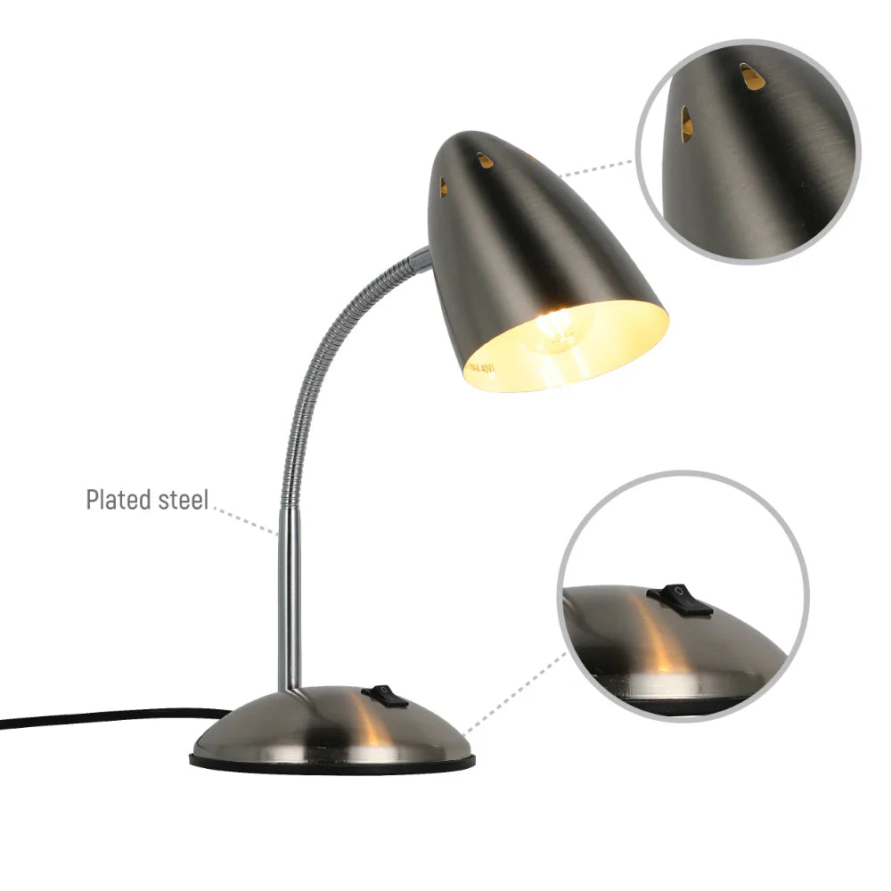 Introducing the TEKLED Versatile Flex-Neck Desk Lamp "” your perfect companion for work and study, now available in Antique Copper, Pearl Black, and Sand Nickel finishes. Crafted for focused task lighting, this adjustable lamp boasts a flexible neck to direct illumination precisely where needed. Its robust metal design not only brightens your desk but also adds a touch of sophistication to your workspace with its array of elegant colour choices.