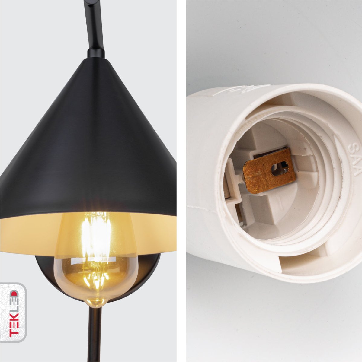 Shaped like a birthday hat, the Metal Funnel Suspended Wall Light with E27 Fitting Black White is a modern design will add funky and playful vibes to your spaces. A perfect bedside lamp, it will suit bedrooms, kids rooms, study rooms, as well as lobbies, corridors, porches, reception areas or spaces where light is focussed on wall art, photographs, or shelf items. With its unique shape, it will work wonderfully well in cafes and restaurants. It is available in white and gold colour variants, it looks best paired with a warm or yellow toned bulb. Warm lighting feels natural in the evenings and promotes relaxation. Warm, or soft white, light, is especially appropriate for cosy living spaces where we want to relax and be comfortable. This wall light is compatible with dimmer switches, but the bulb is not included in the package. Make sure to add an E27 bulb to your cart when ordering.