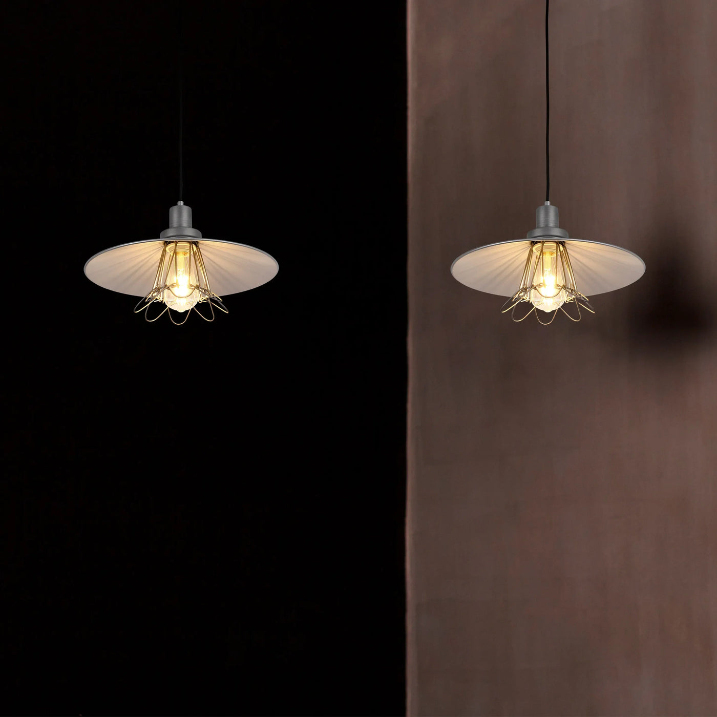 This single, ceiling-mounted pendant light embodies industrial-vintage style. Its wide, shallow, circular shade is suspended by a black cable from a circular ceiling rose. An open wire cage beneath the shade surrounds the bulb holder, adding to its vintage charm.