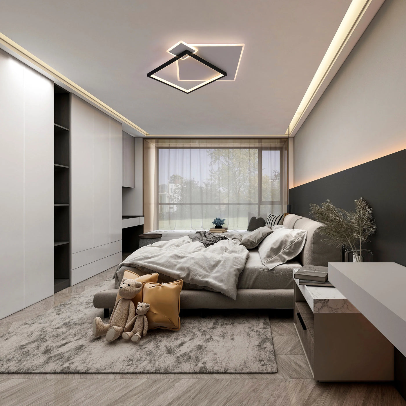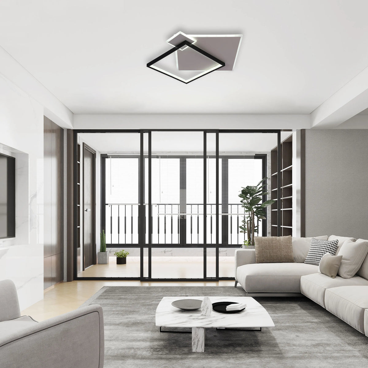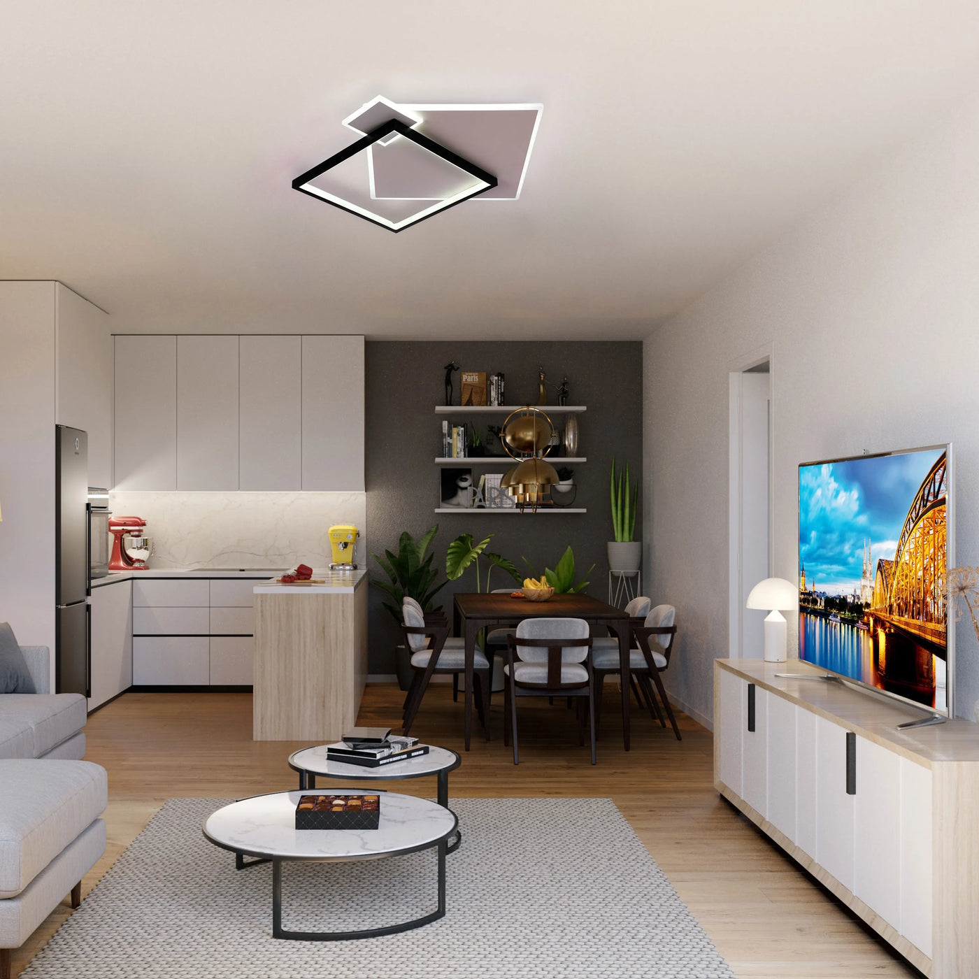 This modern LED square ceiling light features a striking geometric design with two unique variants, both combining black and white finishes for a sleek, contemporary look. Each variant has three overlapping squares, with some trays emitting light from the outer edges, while the square frames emit light from the inner sides. The remote control allows you to adjust both the brightness and colour temperature (CCT), offering a wide range of lighting options from warm to cool white. The flush-mount design makes it a perfect fit for low-ceiling homes, ensuring it provides stylish lighting without taking up vertical space. Available in two design configurations, this light fixture offers both functionality and elegance for residential and commercial spaces.