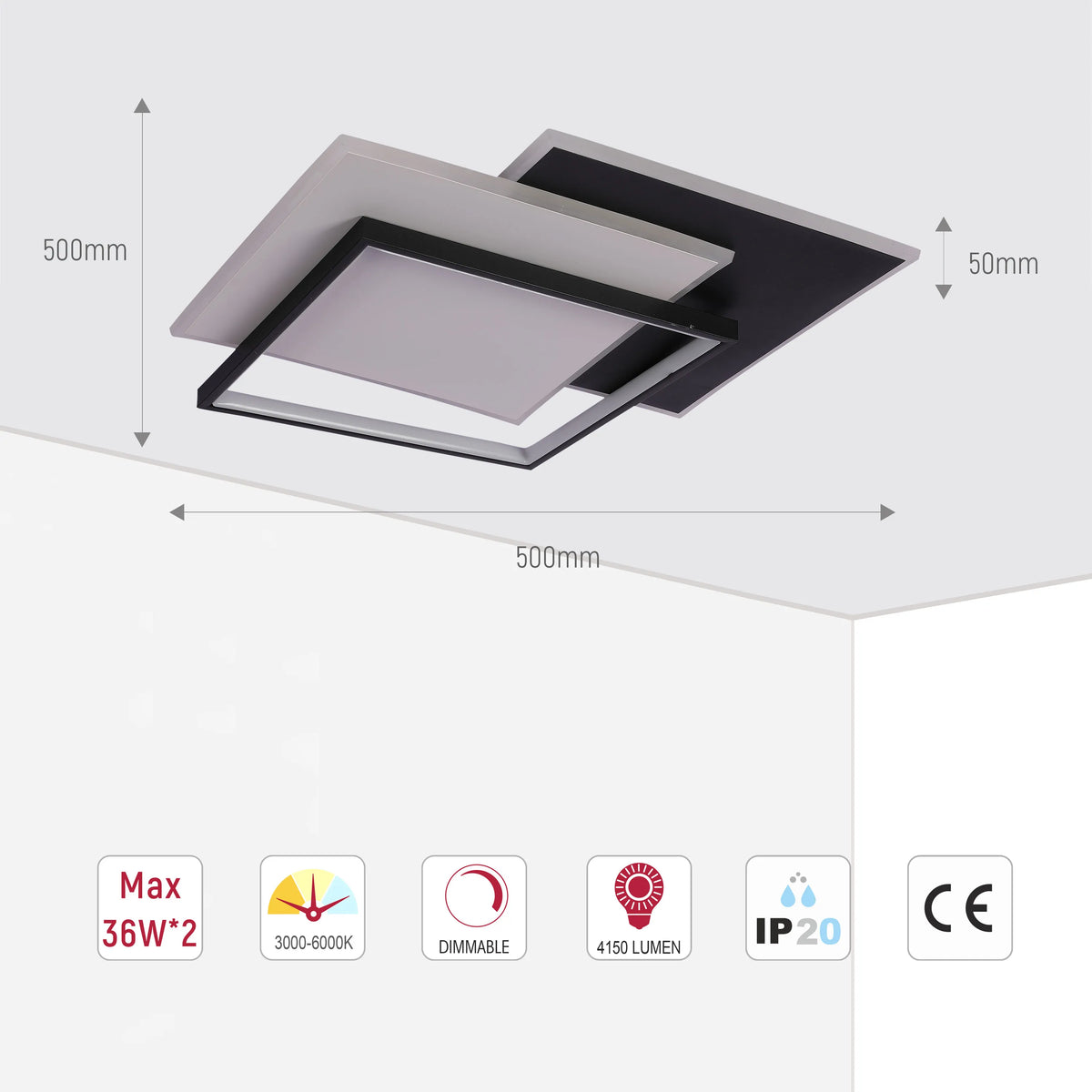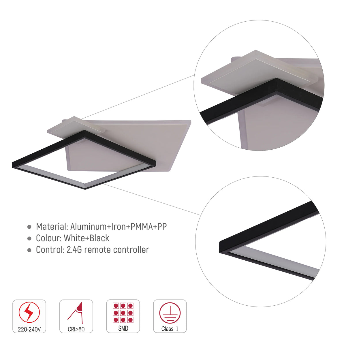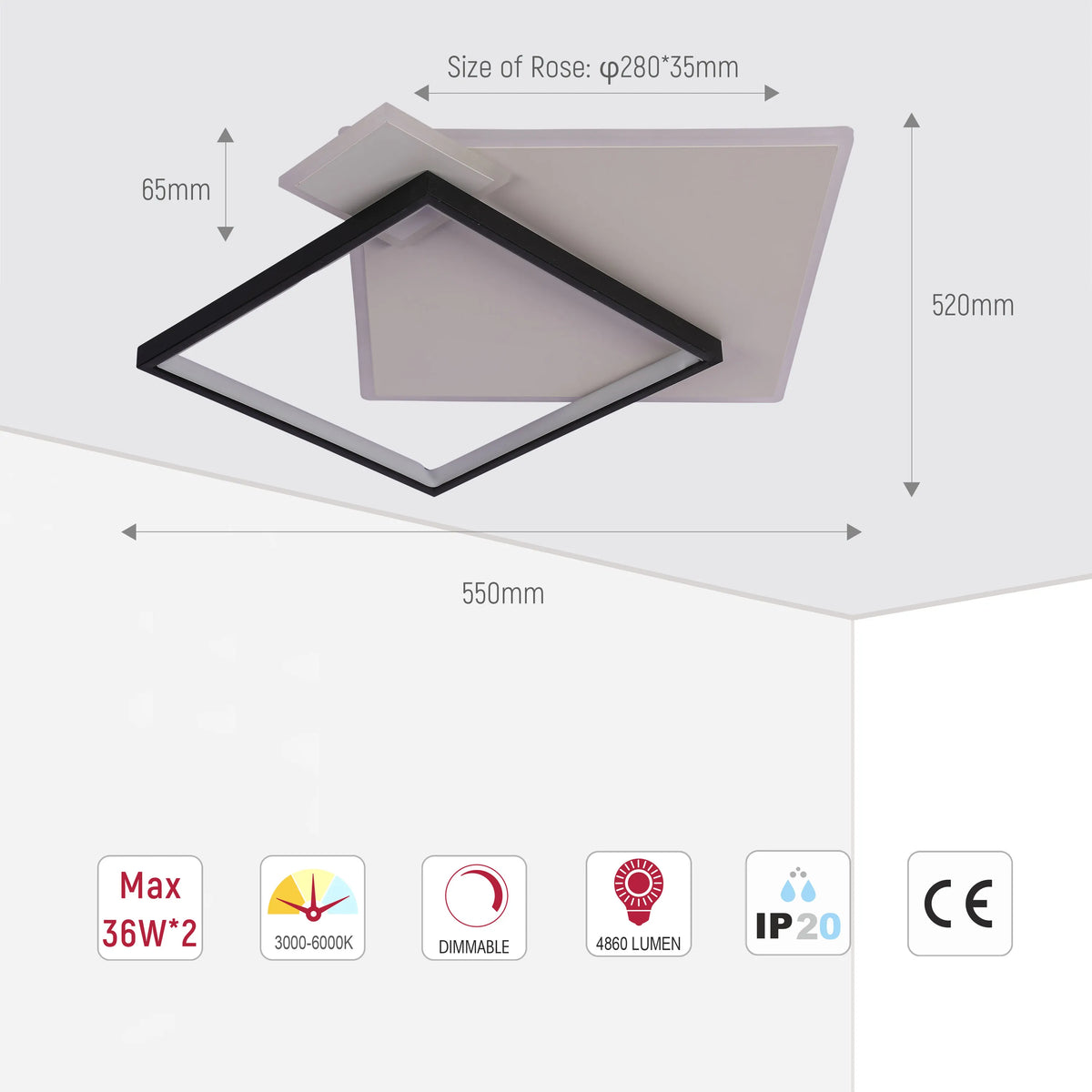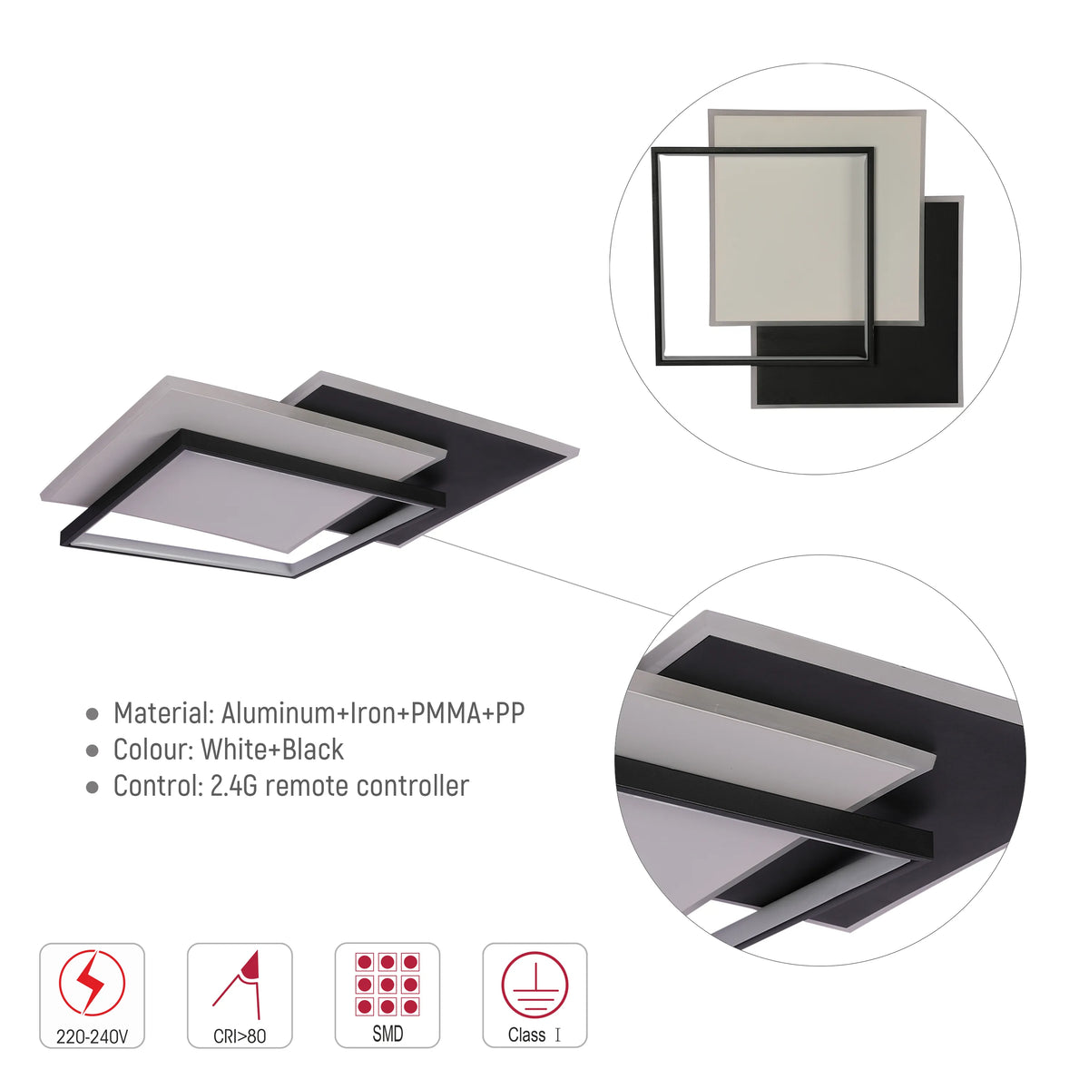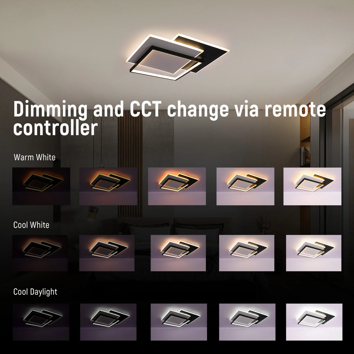 Layered Square LED Ceiling Light, CCT Tunable with Remote, Black & White, 72W, Flush Mount |