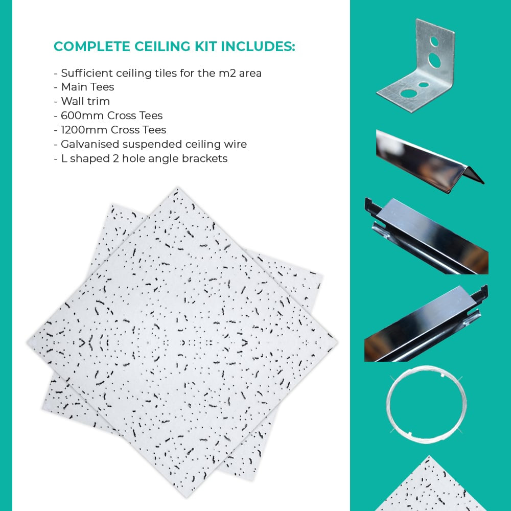 Complete Installation Kit: This kit includes all the necessary components for a full ceiling installation, including enough ceiling tiles for the area, 600mm and 1200mm cross tees, trim, main tees, suspended ceiling wire, and brackets.