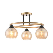 Suspended elegantly from the circular frame are amber-coloured globes, each held in place by a black holder that complements the overall design. The warm glow of the amber glass, paired with the contrasting black and gold elements, creates a harmonious and inviting ambiance. The choice of 3, 4, or 5 globes allows for versatility in lighting intensity and room size compatibility.