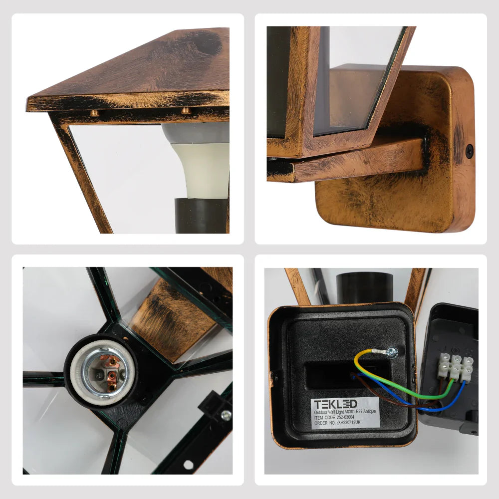 The charming outdoor wall lamp from TEKLED captures the essence of traditional charm and contemporary functionality. Cast in timeless black or rich antique hues, this fixture's lantern design harkens back to the classic street lamps that once lit the cobblestone lanes of yesteryear. It is fashioned from robust aluminium, ensuring durability while offering a nod to heritage in its design. The clear glass panels encase the light source, offering a window into the warm glow within, which can either ascend to the stars or descend, guiding your way.