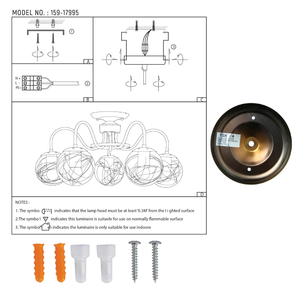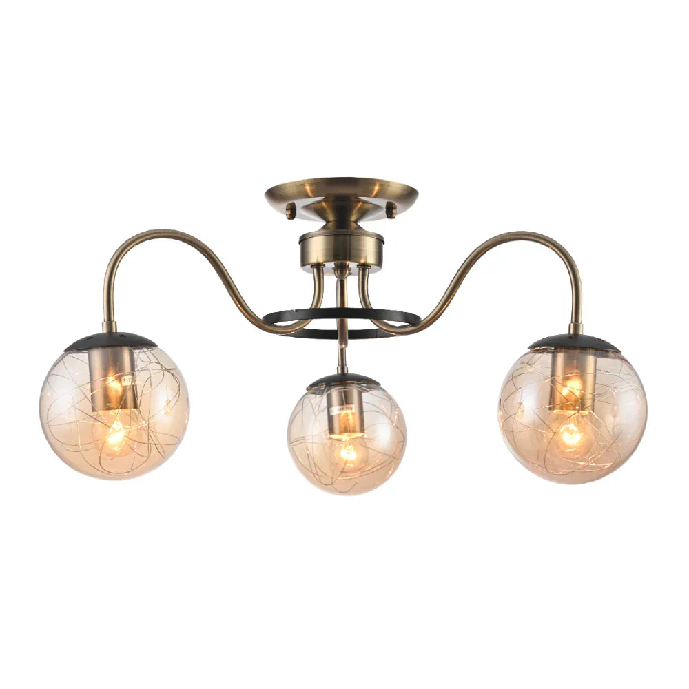 At the heart of this light's design is a beautifully crafted ceiling rose, reminiscent of a blossoming flower with its lid-like cover and inverted cylindrical center. From this central piece, arms extend gracefully, arching in a refined swan neck silhouette. Each arm culminates in an amber-hued globe, delicately suspended and casting a warm, inviting glow. The globes are adorned with an intricate wire pattern, creating a mesmerizing play of light and shadow, reminiscent of vintage artistry.