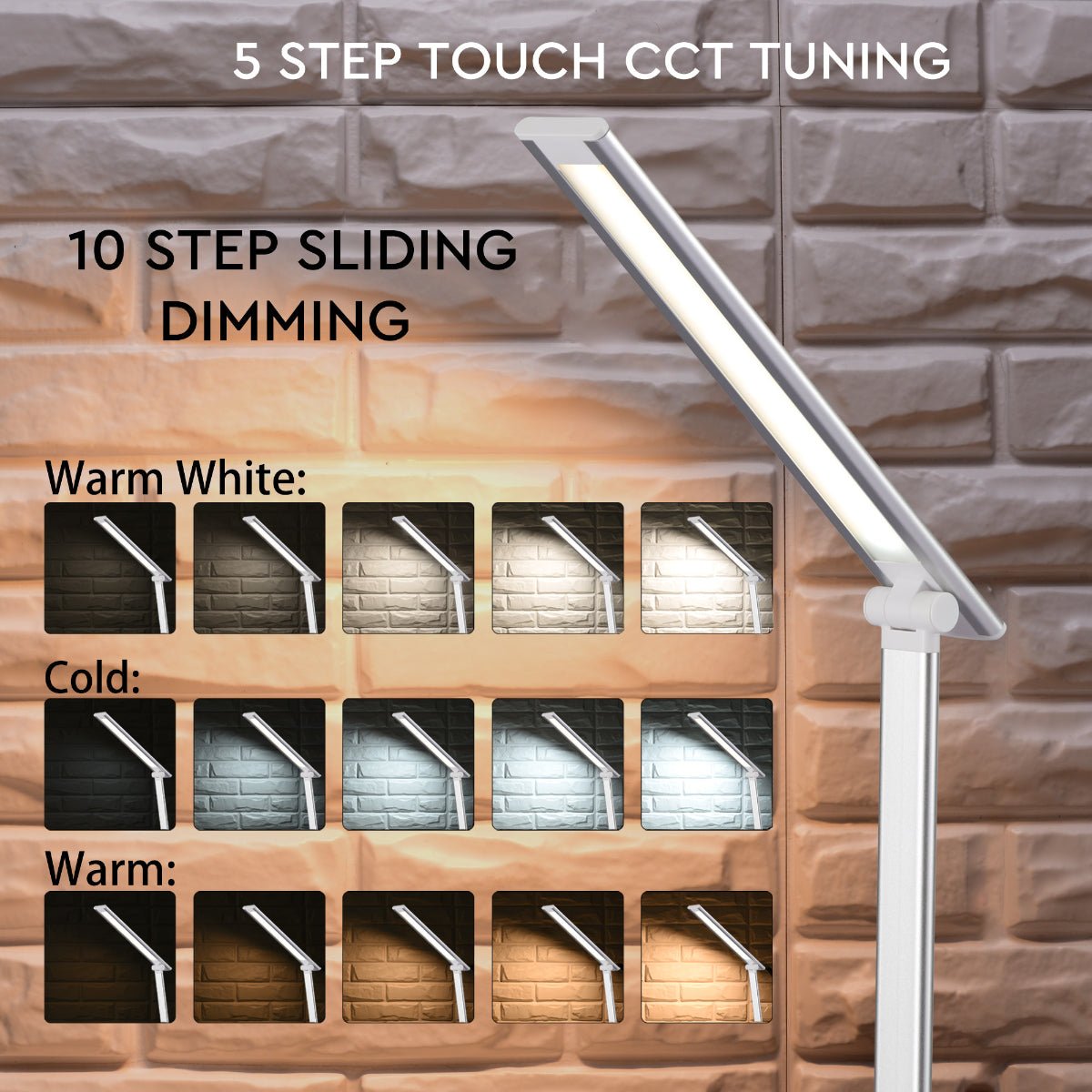 TEKLED presents a portable flexible touch 550LM 10W 5 Level Brightness adjustable 3000K, 3500K, 4300K, 5500K, 6500K LED light reading table Lamp in silver and black.